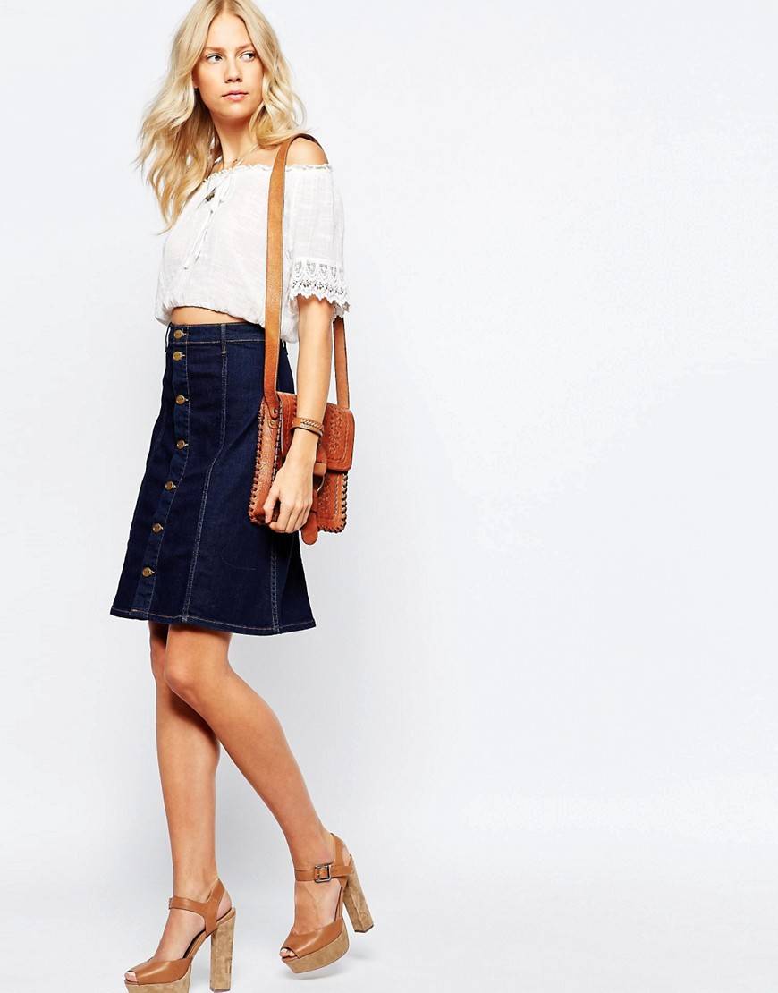 Комбинируя летние джинсовые юбки с различными вещами, можно создавать оригинальные яркие образы. Трапеция с завышенной линией талии отлично смотрится со свободным топом без рукавов, босоножками, сумкой из кожи и шляпой. Пышный фасон колокол длиной ниже колена гармонирует со строгой блузой либо джемпером, классическими лодочками.
