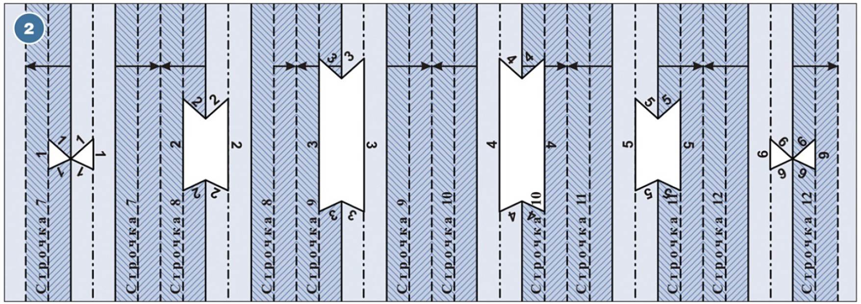 Сначала нужно создать эскиз, на нем определить ширину складок, расстояния между ними и стороны их заутюживания (1). Затем отметить участки, которые будут высекаться. Высеченные участки могут иметь любую форму и либо заканчиваться у строчки застрачивания складки, либо не доходить до нее.