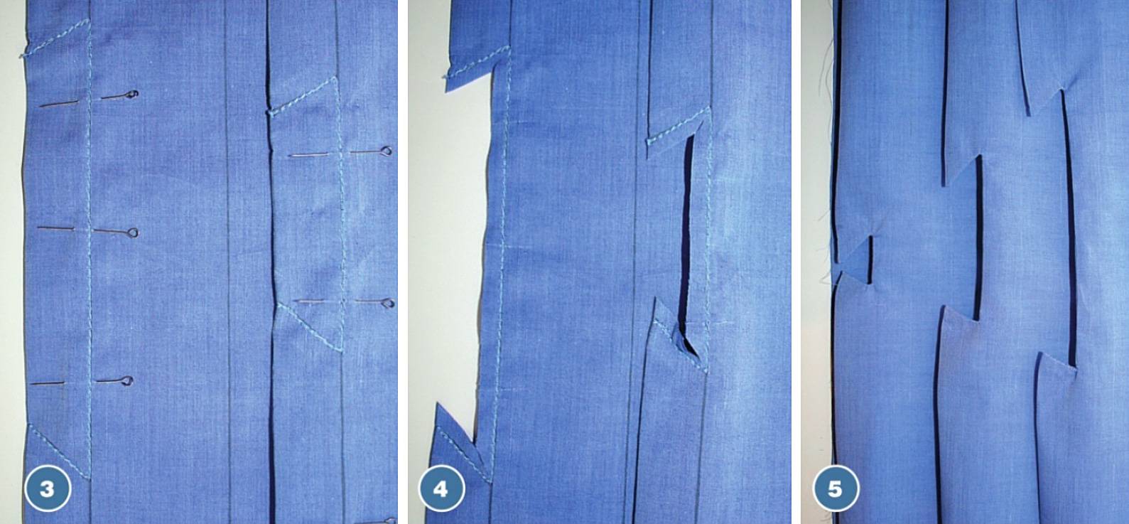 Сначала обтачиваются высеченные участки: для этого деталь перегибается по намеченной линии сгиба лицевой стороной внутрь, скалывается булавками и обтачивается по разметке двойной строчкой (строчки прокладываются максимально близко друг к другу для прочности готового узла) – илл. 3.