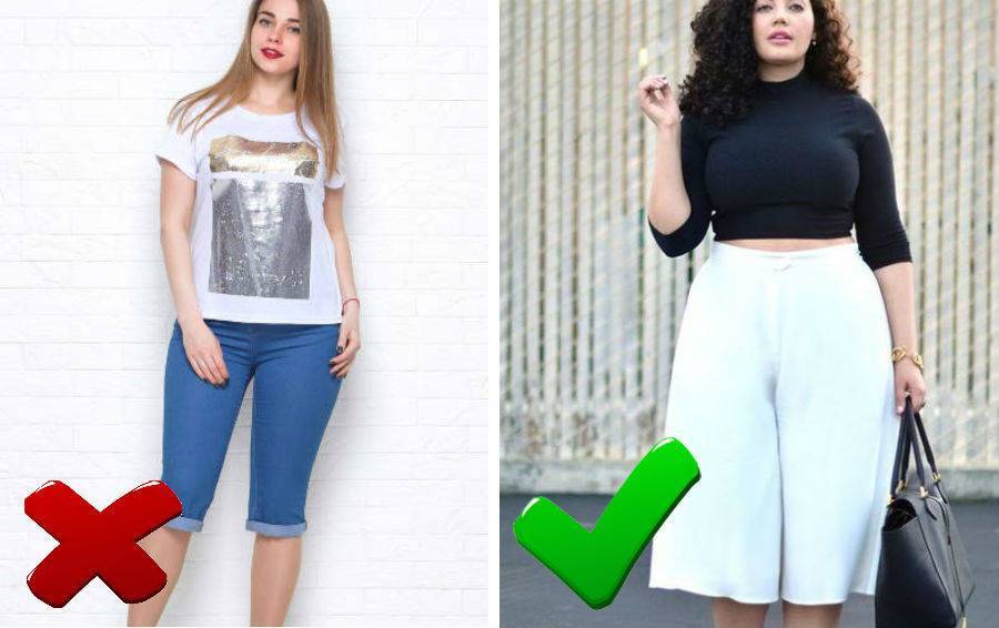 Укороченными могут быть только зауженные модели или кюлоты (и то, чуть ниже колен). Прямые или широкие брюки чуть выше щиколотки сделают непропорциональной любую фигуру.