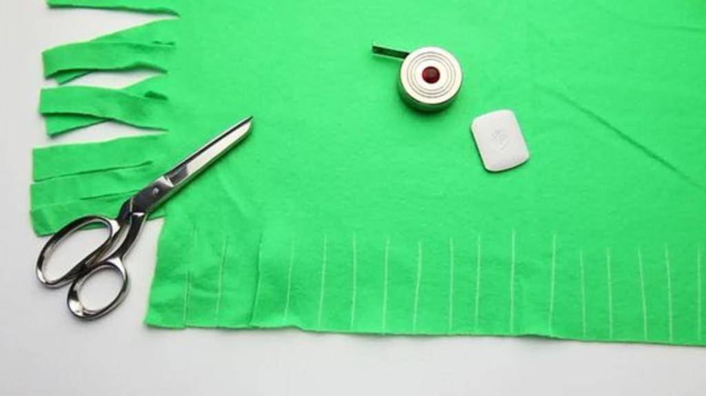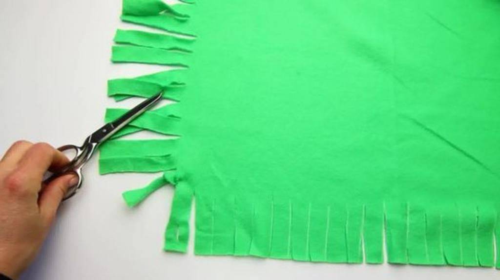Если вам не нравится шить, то вы можете соединить две стороны ткани без ниток. Для этого вырежьте в каждом углу квадраты площадью 5 кв.см. Затем разметьте край вертикальными полосами высотой примерно 5-7 см и шириной 2,5 см. Надрежьте ткань острыми ножницами. Проделайте ту же операцию с оставшимися сторонами.