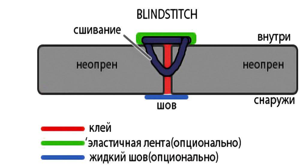 Тут все швы проклеены и прошиты на славу, что даёт возможность носить его в довольно холодную погоду. По исполнению немного напоминает предыдущий вариант, но с тем отличием, что края тут склеиваются и прошиваются изнутри. Воды внутрь попадает очень мало, поэтому эластичный и лёгкий блиндстич можно носить при катаниях в холодной воде.