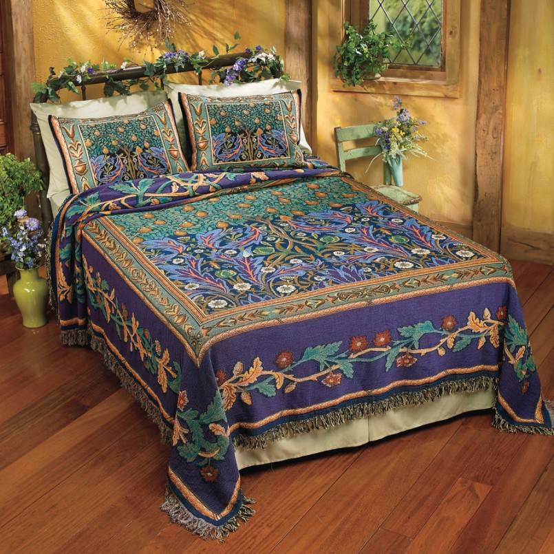 - гобелен самодостаточен, прекрасен сам по себе, однако в целях связки интерьерных элементов было бы неплохо выбирать расцветку под цвет стен или гардин, особенно для маленьких помещений. Особенный шик – картина из гобелена на стенке. Большинство производителей выпускают наборы с общим сюжетом, в которые входят покрывало, декоративные наволочки и картина;