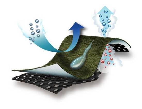 - Беспоровая. Этот тип покрытия больше напоминает губку, впитывающую жидкость. Она собирает испарения человеческого тела не в виде пара, а в виде конденсата (капель пота) и транспортирует их во внешний слой ткани. Это становится возможным благодаря разнице в показателях давления водяного пара с разных сторон мембраны.