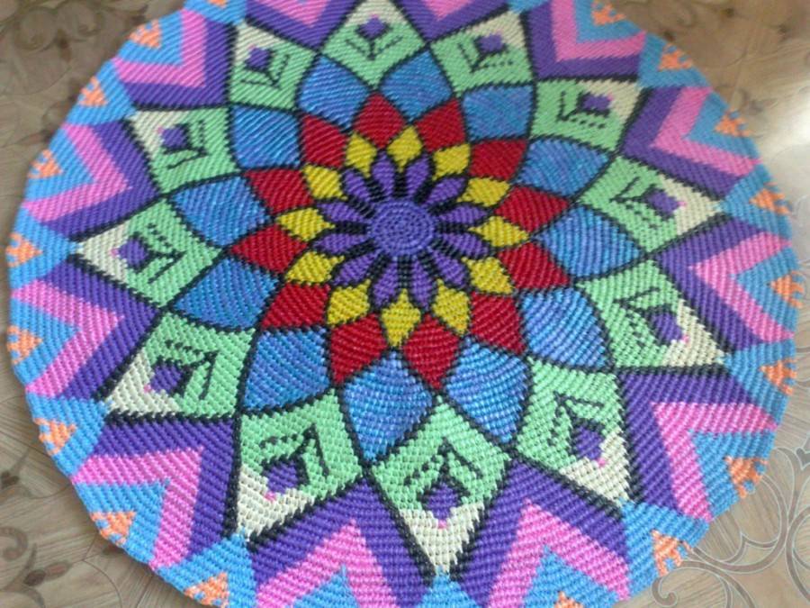 Если вы решите реализовать схемы ковриков из ниток на сетке, то сначала должны будете приготовить саму сеть, которая несложно вяжется вручную. Вяжите основу путем чередования столбиков и воздушных петель. Только после завершения сетки приступайте непосредственно к орнаменту. Например, вы можете создать геометрический узор, как на фото.
