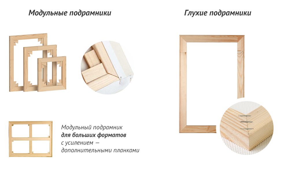 Подрамники заслуживают отдельного внимания (поста), но если кратко, то лучше выбирать не глухой, а модульный подрамник. Модульный подрамник дает возможность в случае провисания холста натянуть его с помощью прилагающихся к нему колышков.