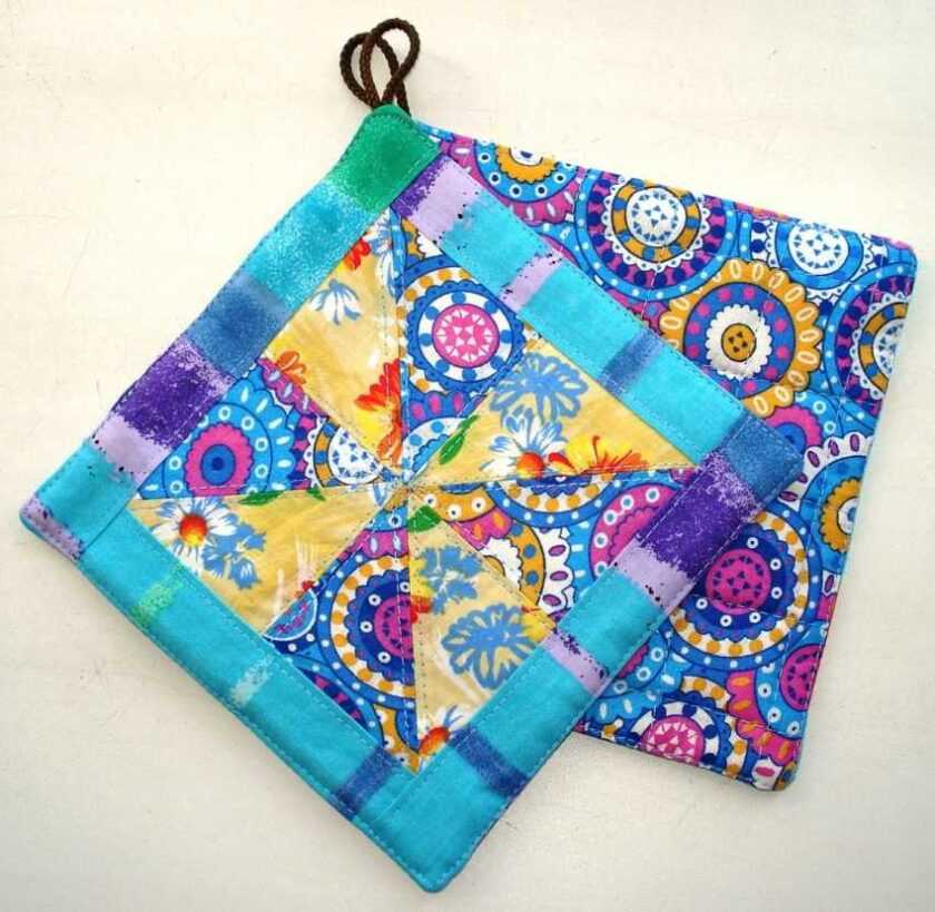 Чтобы сделать простое изделие в технике пэчворк, нужно подготовить три цвета ткани, нож, нитки, соответствующие по цвету материи, булавки и линейку. Затем подготавливаем лоскутки – квадратики со стороной 10 см. Каждый из квадратиков разрезается на треугольники, а они уже укладываются так, как того требуют схемы. Все треугольники сшиваются вместе, и получается одна сторона изделия. По такому же принципу делается и вторая сторона, а между ними помещается подкладочный материал. Затем аккуратно зашивают края, а к уголку крепится петелька – все, прихватка готова.