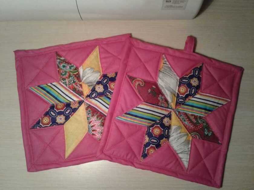 Перед началом работы делают схему, на которой намечают расположение лоскутков. Затем переносят ее на изнанку основы – хлопчатобумажной или флизелиновой ткани. Кусочки материй нарезают в соответствии со схемой и по очереди сшивают, прикладывая к основе. Аналогично мастерят другую сторону. Между получившимися лоскутными заготовками вкладывают наполнитель и прошивают – прихватка в технике «пэчворк» готова.