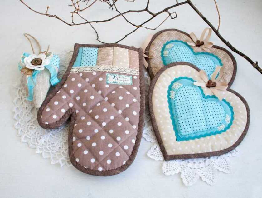 Вы можете выбирать не только оригинальные ткани, но и формы – сердечки и рукавички, клубнички и елочки, квадратики и звездочки. Также имейте в виду, что разные формы прихваток различаются по функциональности, а значит, лучше всего сделать полноценный универсальный набор: несколько квадратиков, длинная прихватка для кастрюль, варежка.