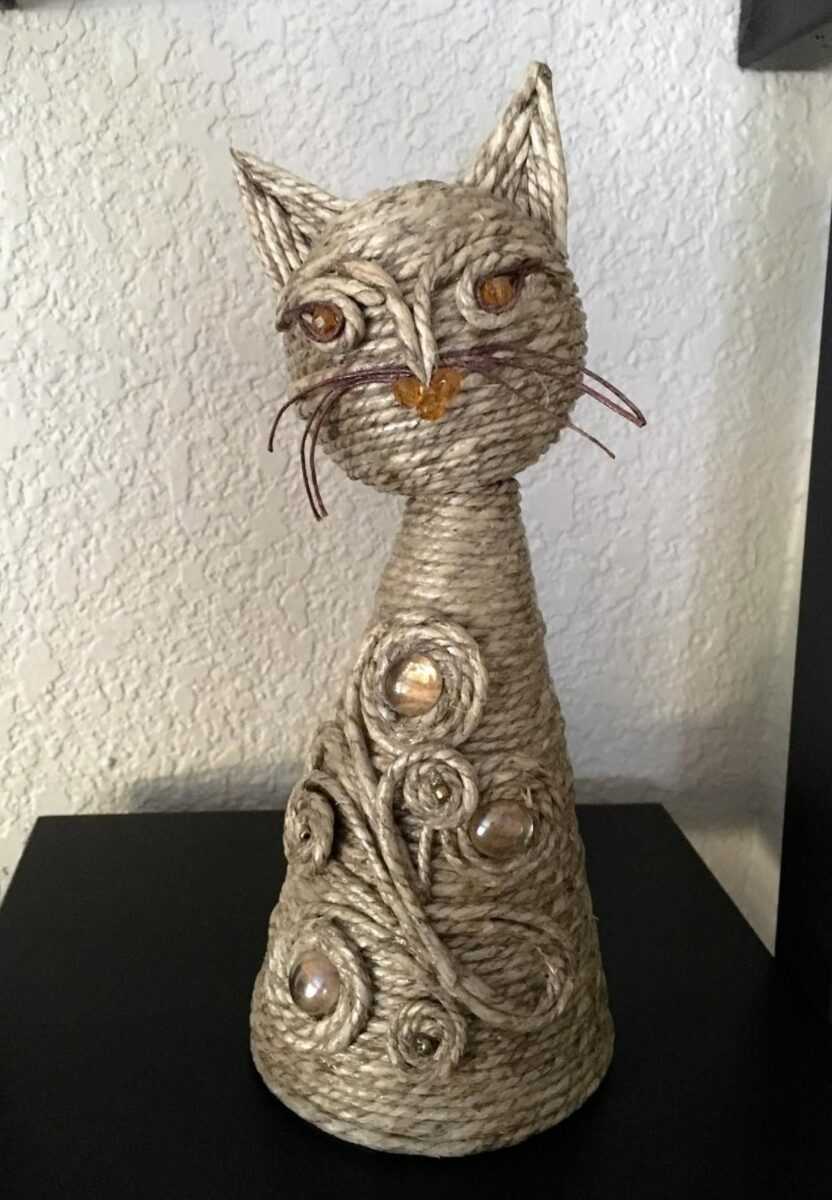Дизайнерские фигурки котиков, зайчиков, собачек, совушек и лисичек, предназначенные для украшения интерьера, радуют любителей хэндмейда от мала до велика. Их популярность среди созданных своими руками поделок из джутового шпагата можно считать наиболее высокой. Несмотря на то, что они, в основном, не имеют утилитарного значения, их с удовольствием делают в качестве подарков, сувениров и конкурсных работ.