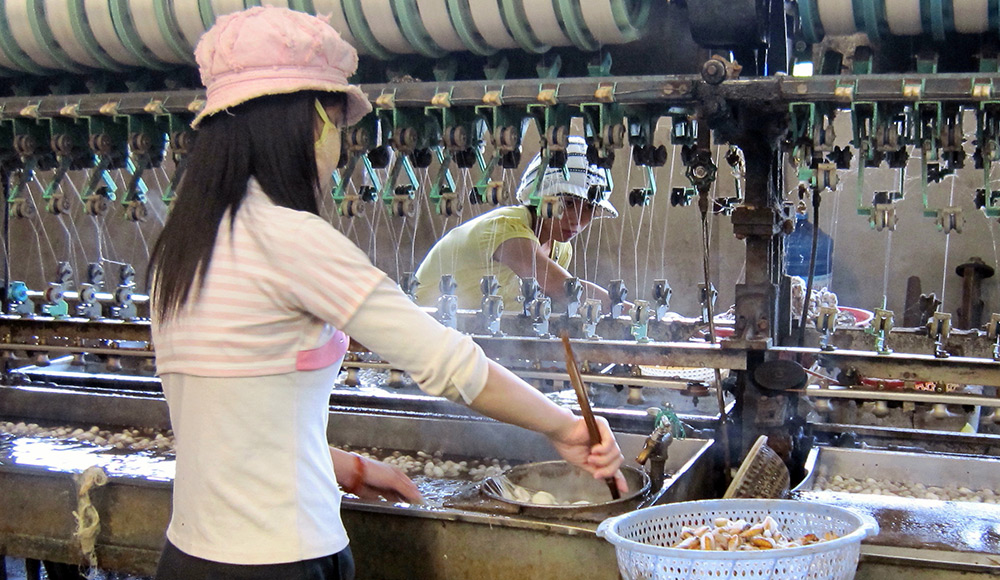 Традиционно производством шелка в Китае занимались исключительно женщины. Получение волокна было кропотливым и деликатным трудом, требовавшим тонкости, внимания и терпения. Сейчас шелковые ткани изготавливают в цехах при помощи машин и станков.