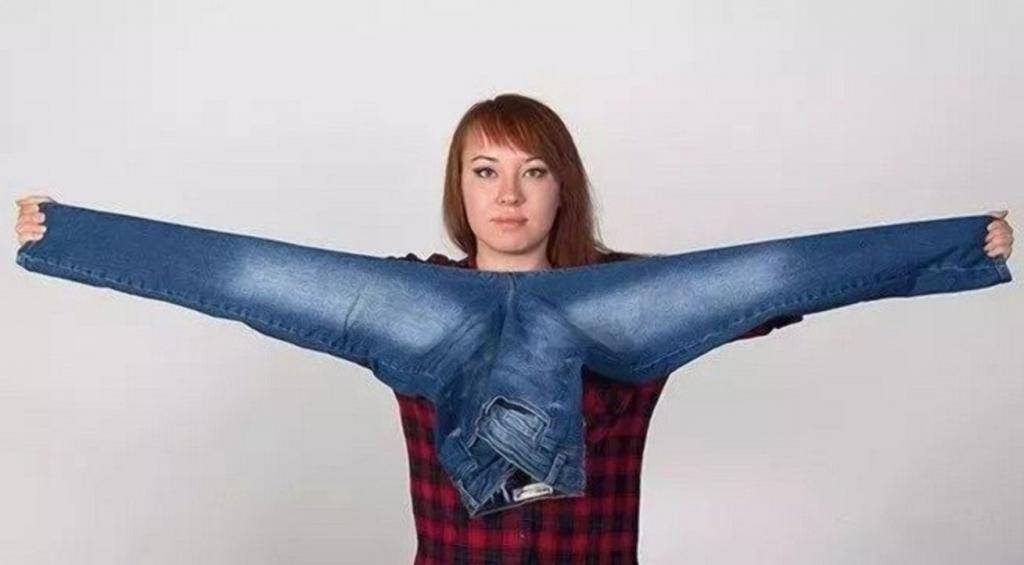 Возьмитесь за нижние края ваших джинсов, а затем разведите руки в стороны настолько широко, насколько это возможно. Если средняя часть джинсов находится под подбородком или даже соприкасается с ним, все отлично, вы нашли свою идеальную длину.