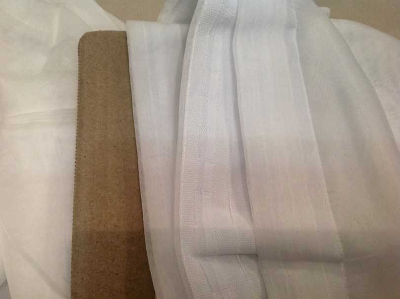 - Последние этапы предполагают соединение тесьмы и тюля. Полоску надо прикладывать так, чтобы петли оказались снаружи. Тогда при соединении с карнизом возникает меньше проблем.