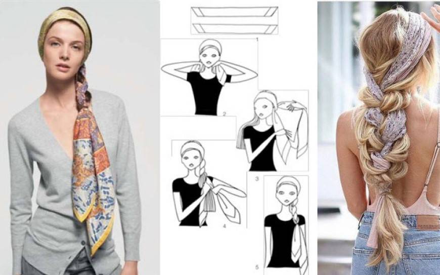 Лучшим приемом будет вариант «узелок». Сделайте из платка повязку, завяжите под волосами. Для лета лучше купить косынку.