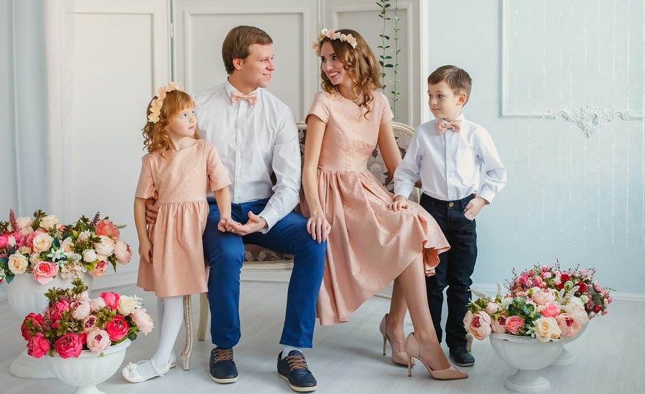 Каждая семья по-своему уникальна, поэтому существует много вариантов создания стиля фэмили лук. Подбор одежды для семейной фотосессии может быть таким:
