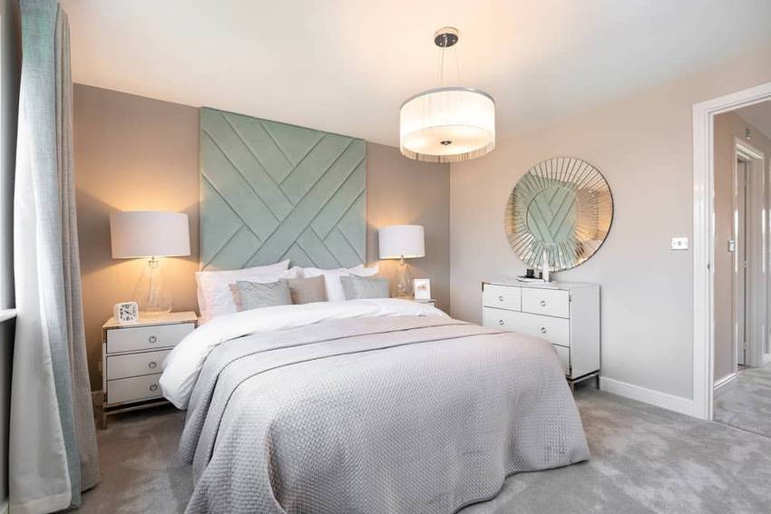 - Сочетающийся декор Еще один стилистический ход – продолжение идеи декора на покрывале, акцентной стене над кроватью или изголовье. То есть добиться единства фона одеяла и изголовья. Естественно, 100% сходства добиваться не нужно; это слишком скучно для общего интерьера. Цвет покрывала должен отличаться минимум на 2-3 тона от декора, обоев и штор. В качестве ориентира в декоре можно выбрать набор мебели или другие важные элементы интерьера, которые будут акцентированы в вашей спальне.