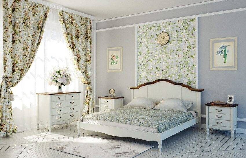 Для спальни в стиле «прованс» подойдет покрывало спокойных тонов с лаконичным геометрическим или растительным орнаментом. Хорошо смотрятся на таких покрывалась изображения стеблей, цветов и певчих птиц. Лучше выбирать натуральные ткани для такого стиля.