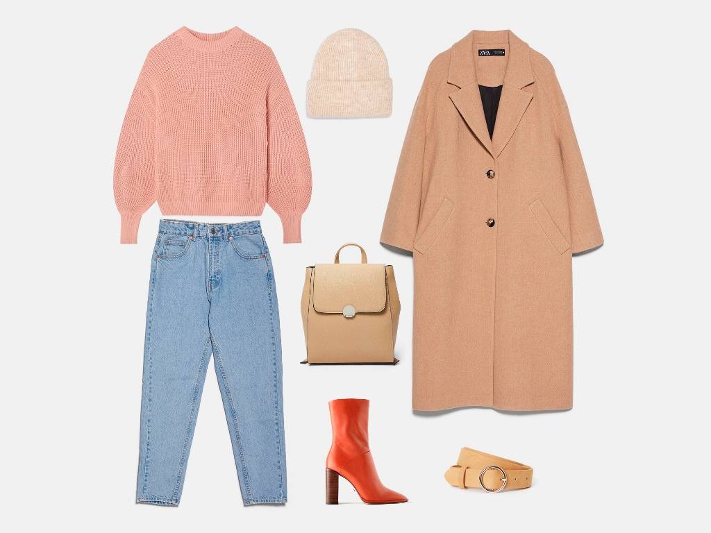 И, наконец, четвертый образ понравится тем, кто уже устал от серой зимы и соскучился по нежным весенним оттенкам. В таком наряде идеально гулять по парку под теплым солнышком. За основу взяты джинсы mom fit и структурный вязаный свитер с объемными рукавами. В качестве обуви – ярко-оранжевые ботильоны на устойчивом высоком каблуке, цвет которых красиво перекликается с цветом свитера. Не забудем про аксессуары: бежевые ремень и рюкзак, в который поместится всё необходимое. Сверху наряда наденем объемное пальто прямого кроя. И, конечно, добавим шапку бини, которая как нельзя лучше подходит к такому расслабленному casual образу.