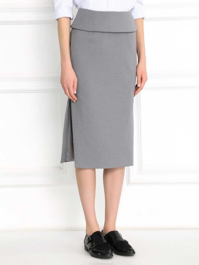 Украсить такую модель могут бантовые или встречные складки. Она хорошо смотрится на стройных девушках. А вот полным дамам лучше избегать подобных фасонов, поскольку они способны сделать фигуру громоздкой. Под эти юбки подойдут балетки и изящные туфли-лодочки. В качестве верха дизайнеры рекомендуют выбирать приталенные блузки или рубашки классического кроя с рукавами три четверти.