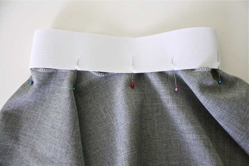 - Пояс складываем пополам и пристрачиваем к верху юбки, оставляя дырки для резинки, которую потом туда же вдеваем и пришиваем.
