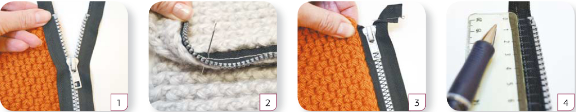 Процесс вшивания замочка в вязанное крючком из пряжи изделие