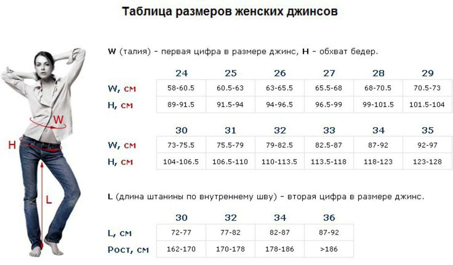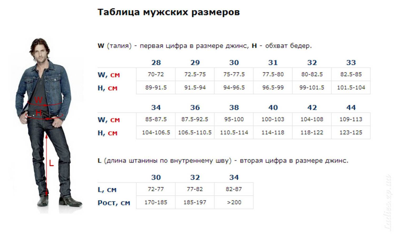 Определить рост джинсов можно по такому соотношению: вторая цифра на ярлычке указывает рост. К примеру, цифра 30 подходит на рост 164 см, 32 – на рост 176 см.