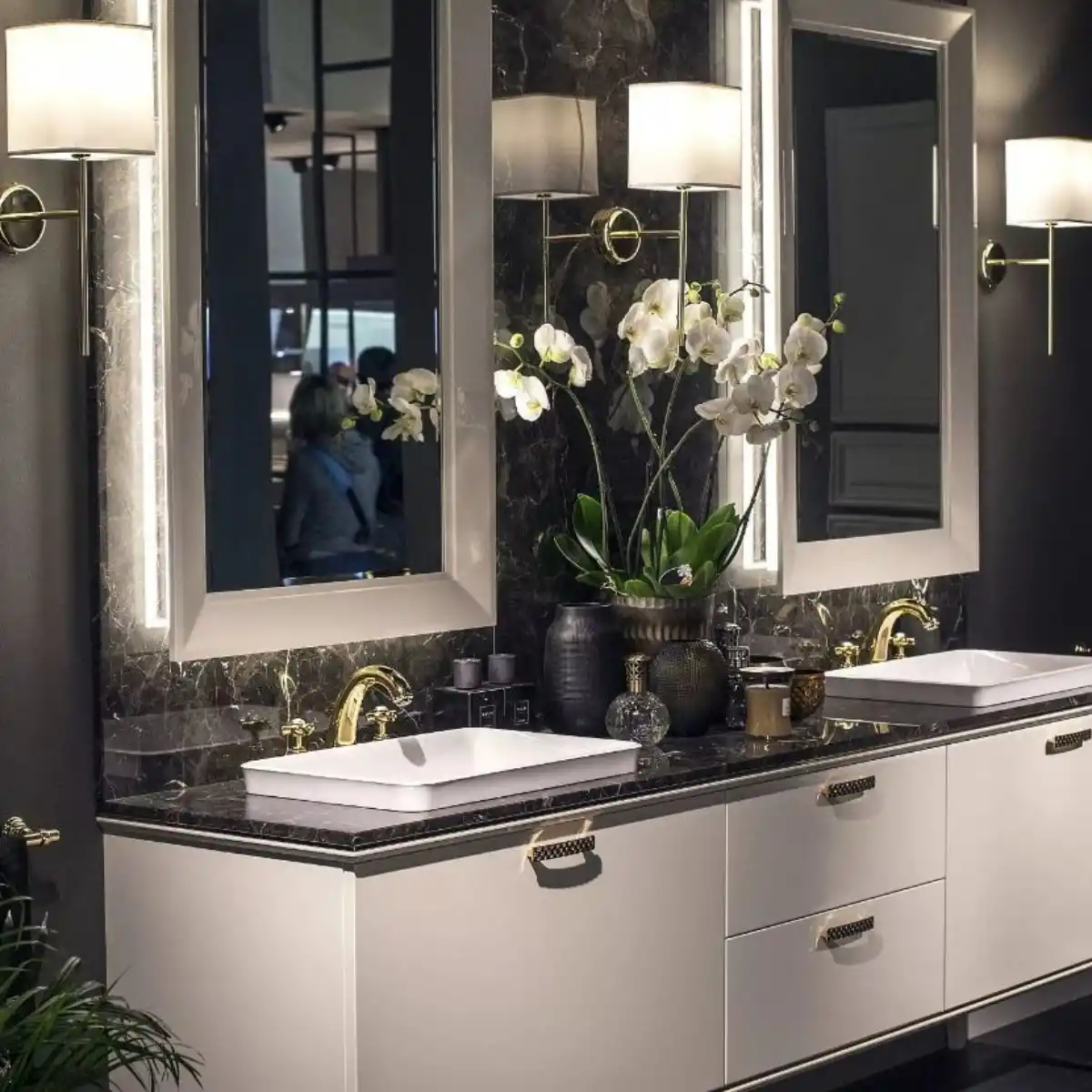 Создайте образ бутик-отеля в своей ванной комнате с темными, чернильно-голубыми или почти черными стенами и потолками. Сделайте этот мрачный, но элегантный декор ванной комнаты с позолоченными зеркалами и роскошными текстурами. В том числе с пушистыми полотенцами, богатыми медными вешалками для полотенец и ковриками для ванной с высоким ворсом. Темные стены создадут уединенную, интенсивную атмосферу. Вы можете найти сочетание с белым полом и яркой ванной, чтобы помочь сбалансировать светлый и темный. Цвет очень важен для создания настроения. Этот баланс темного, светлого и роскошной отделки даст вам почувствовать себя восхитительно.