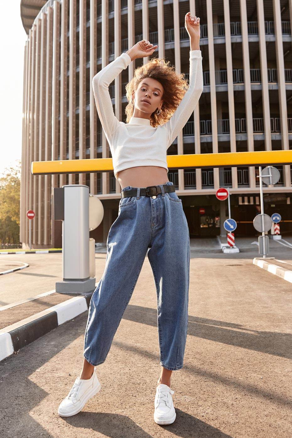 - Высокая – верх у таких джинсов находится где-то на середине талии. Носить их с короткими топами и кофточками можно только стройным девушкам. А вот пышнотелым женщинам лучше либо отказаться от этой модели, либо сочетать ее с длинной и свободной одеждой. Этот фасон отлично «подбирает» живот снизу, но если есть лишние килограммы, они обязательно «выползут» наверху.