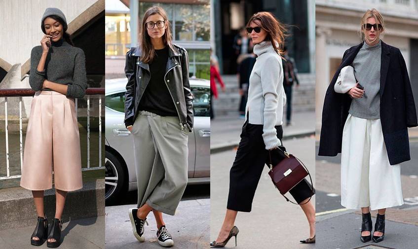 Чтобы выглядеть привлекательно, кюлоты стоит носить с рубашками, блузками, жилетами и приталенными пиджаками. Для прохладной погоды стоит подобрать кожаную куртку. Не менее удачным решением станет тонкий джемпер. Летом кюлоты сочетаются с всевозможными топами, включая и укороченные.