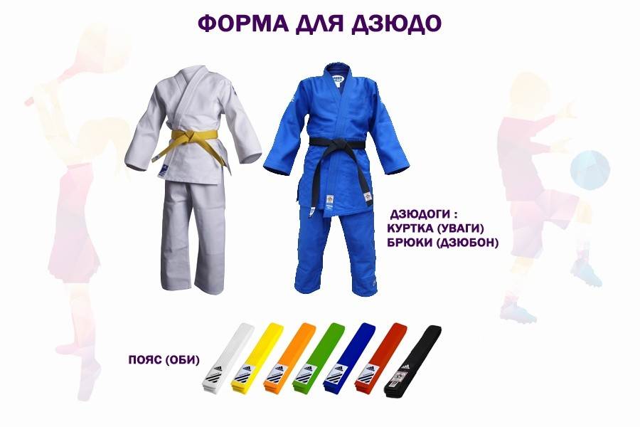 - Ребенку понадобятся дзюдоги обоих цветов: белого и синего. Так как участник, приглашенный на татами первым, надевает белую форму, а второй спортсмен — синюю.