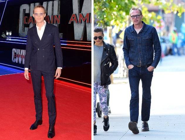 Пол Беттани Слева: на премьере «Первый мститель: Противостояние» в Лондоне, апрель 2021 года. Справа: в Нью-Йорке, октябрь 2016 года.