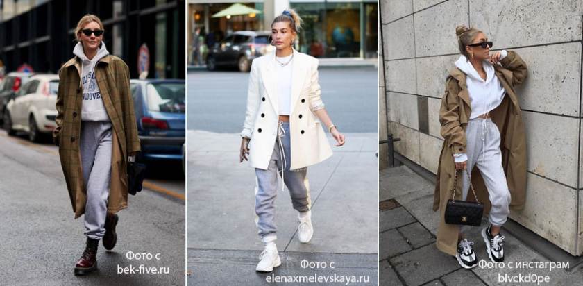Джоггеры – это спортивные брюки, зауженные книзу, с манжетами. Преимущество мужских моделей перед женскими – это объем. Тренд на джоггеры пришел к нам с улицы, причем носим мы их именно с удлиненным верхом (пальто, плащ, шуба) и худи. Такой образ идеален для выходного дня: расслабленный, непринуждённый.