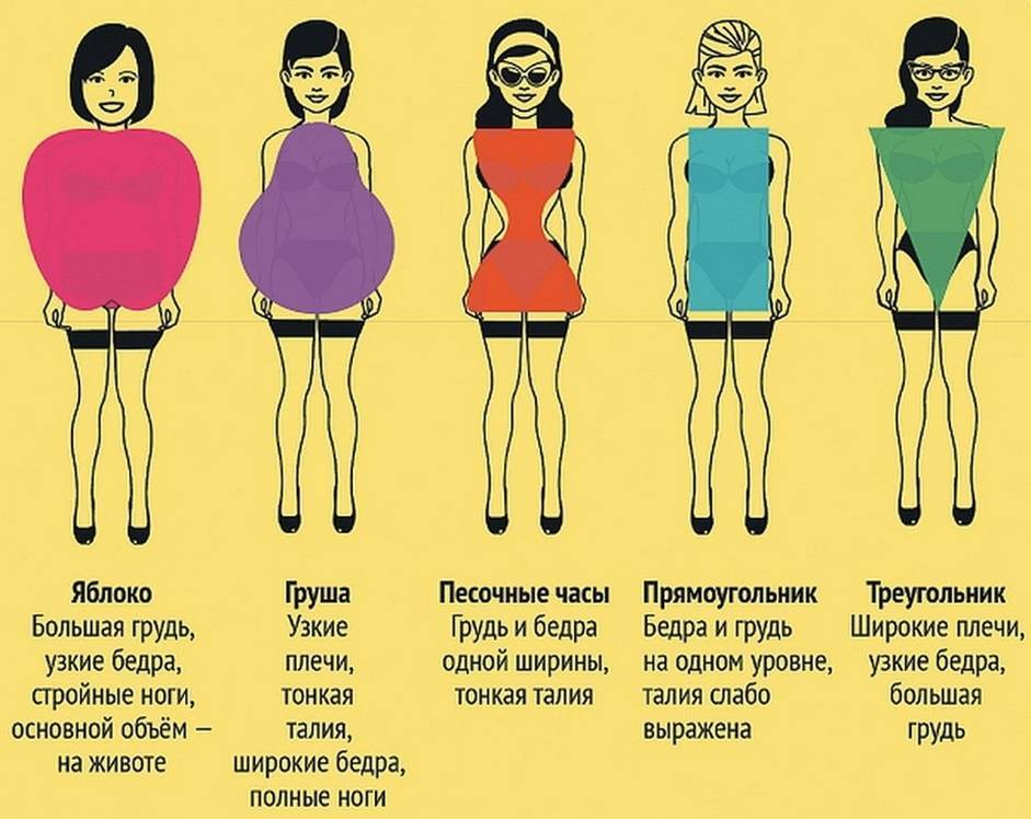 - Яблоко. Объем бедер и плеч практически одинаков, талия не выражена. При избыточном весе талия может быть шире бедер.