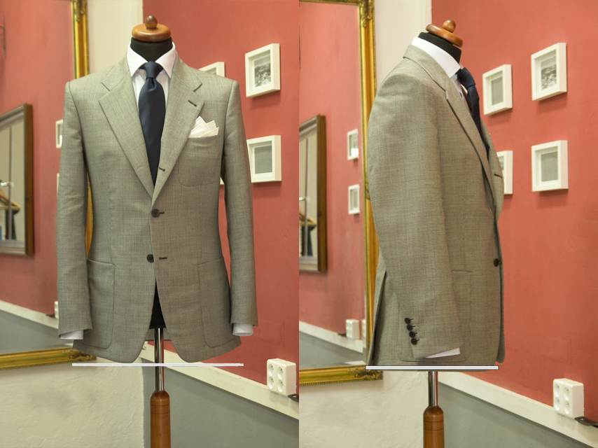 Примерку костюма обычно начинают с пиджака. Идеальный костюм шьётся из специальных качественных тканей, в шерсть добавляют небольшое количество шёлковых и синтетических волокон, чтобы ткань лучше смотрелась и дольше служила. Пиджак не должен быть коротким, изгиб ягодиц закрыт, но линия ног при этом открыта.
