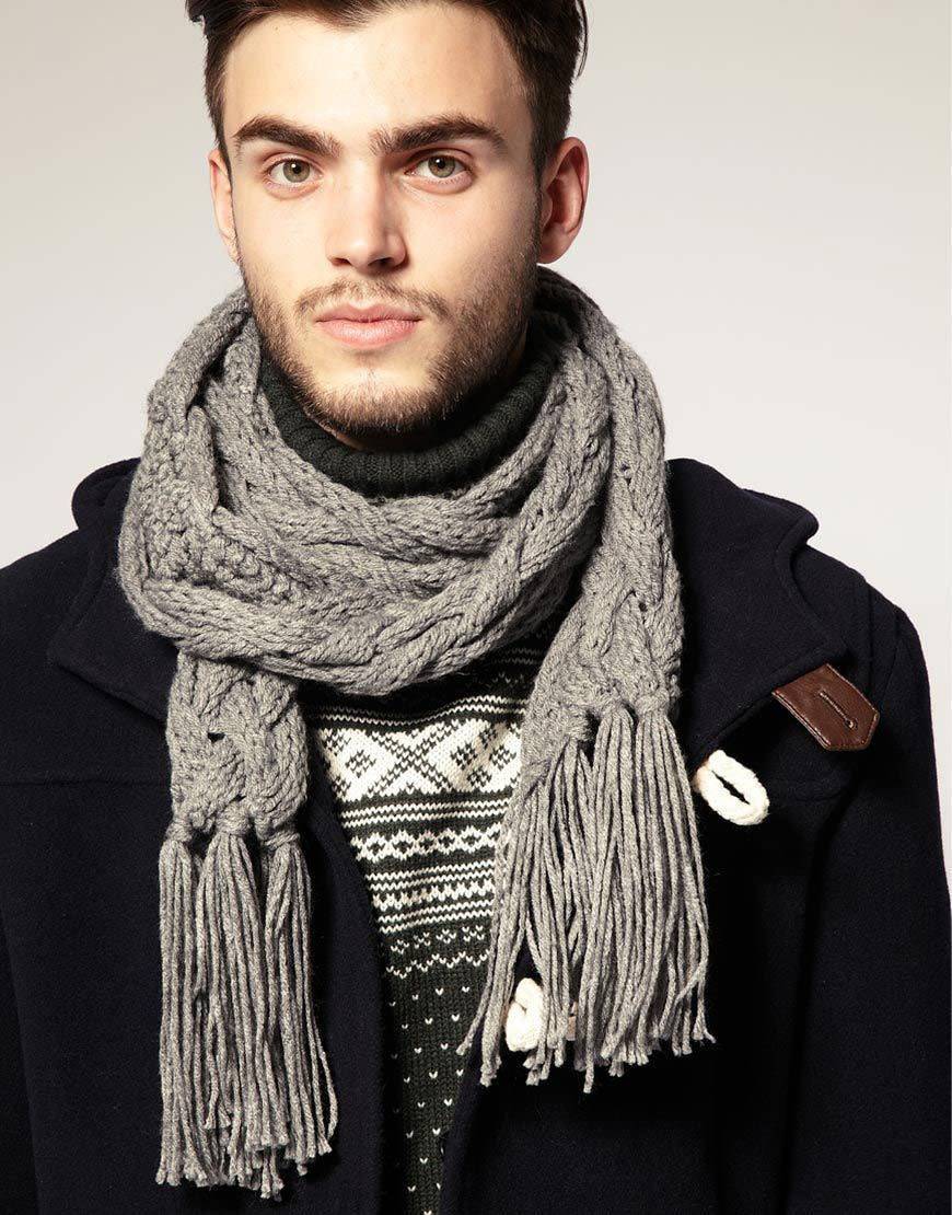 При выборе цвета мужского шарфа стоит отдать предпочтение консервативным цветам, таким как серый и глубокий синий. В качестве принтов мужчины любят выбирать неброскую полоску или сдержанный рисунок