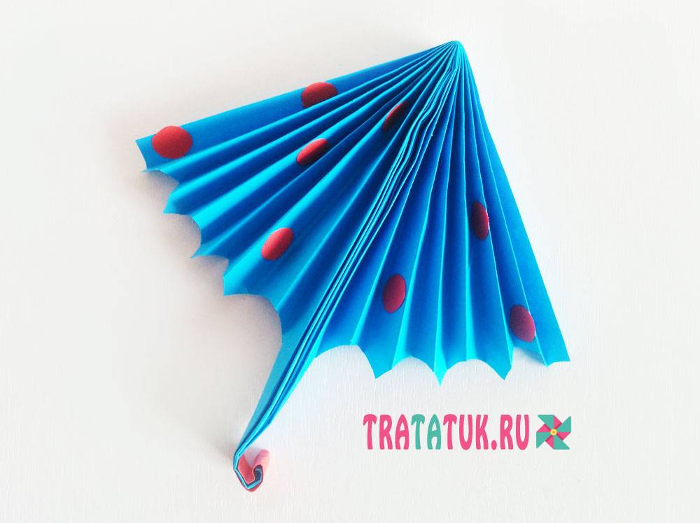 Поделка простая и интересная. А еще ее достоинством является то, что она может быть часть аппликации. Например, дети могут смастерить зонтик, а затем приклеить ее на подготовленный для них рисунок со сказочными персонажами, которых нужно срочно спрятать от дождя, приклеив над ними объемный зонт.