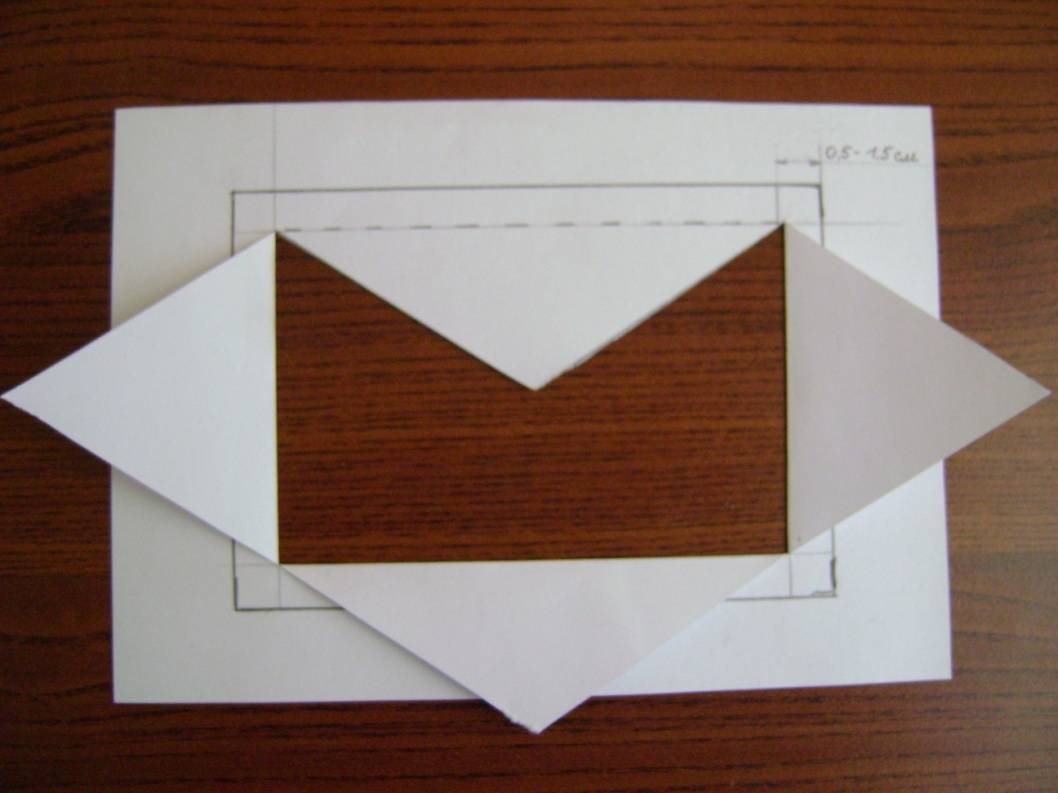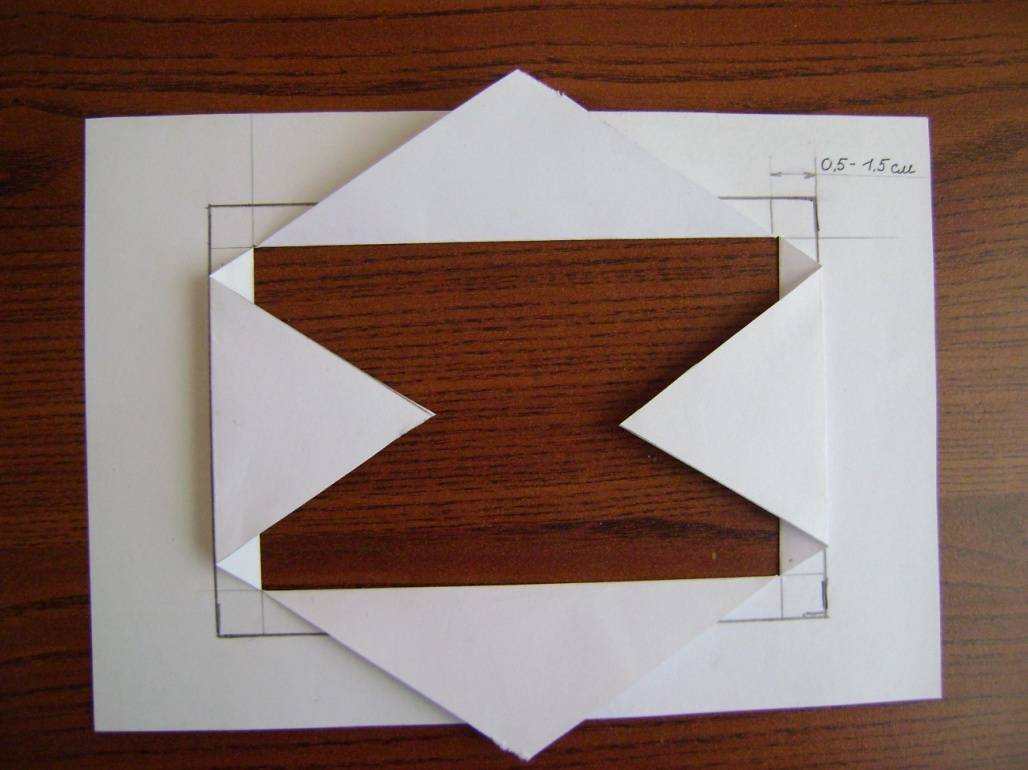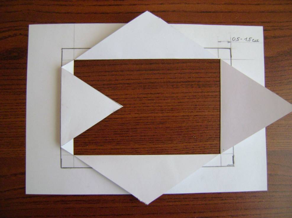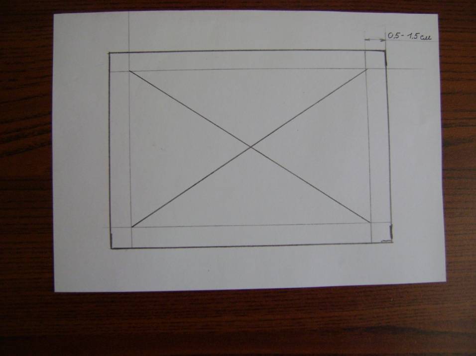 - тщательно подготовьте заднюю часть. Для этого вам рекомендуется сделать те же манипуляции, что и в последних трех пунктах приготовления оформления. Только отмерять теперь нужно не по пять, а по два сантиметра. Размеры получившегося внутреннего прямоугольника должны быть не более, чем 26/21 сантиметров;