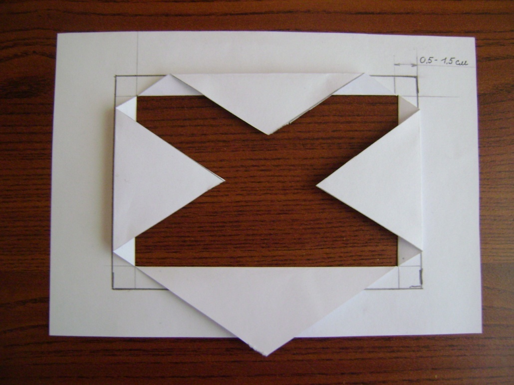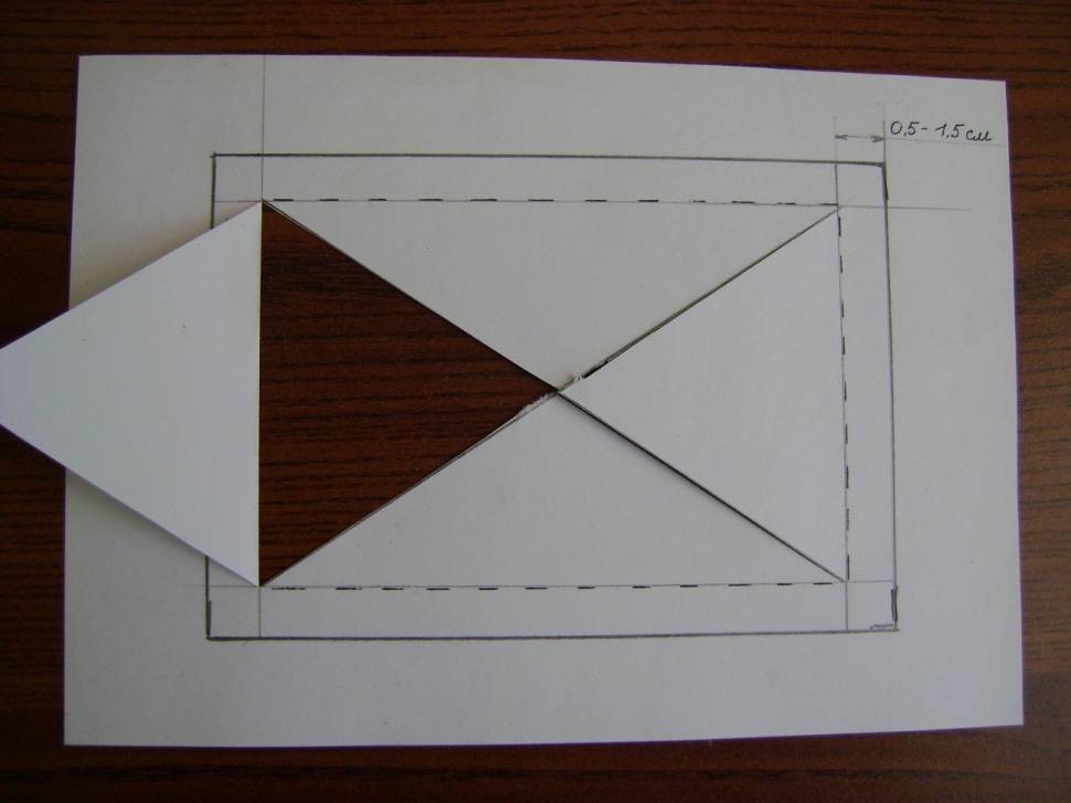 Важно! Только диагонали меньшего прямоугольника!. Затем загибаем по линии сгиба все четыре части прямоугольника. Затем загибаем по линии сгиба все четыре части прямоугольника