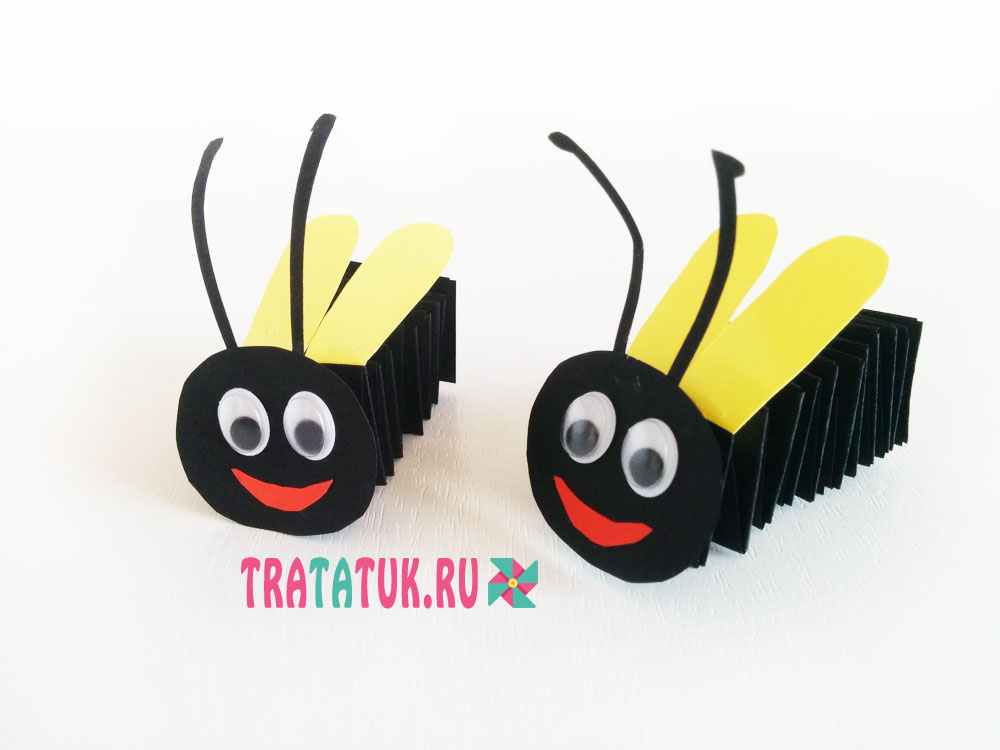 В этой работе немного другая, нестандартная гармошка. Ее выполнение сложнее предыдущих поделок из бумаги в гармошку, где отрезок бумаги попросту нужно сложить в складки, сначала в одну сторону, а затем в другую, повторяя эти действия до конца. Здесь же вырезаются полосы, которые впоследствии складываются друг на дружку, формируя сложную гармошку, но при этом и более устойчивую. Но что об этом много разглагольствовать, ведь можно просто посмотреть пошаговое объяснение с фото в статье – насекомые из бумажных гармошек