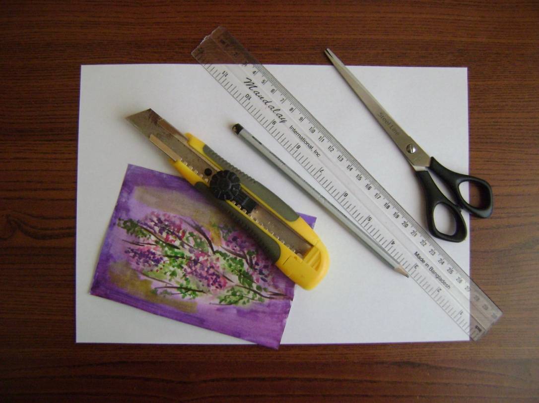 Для работы нам необходимо: рисунок, плотная бумага размером больше чем рисунок ( для оформления работы масштабом А-4 необходимо для паспарту взять лист бумаги масштабом А-3), канцелярский нож или ножницы, линейка, карандаш.
