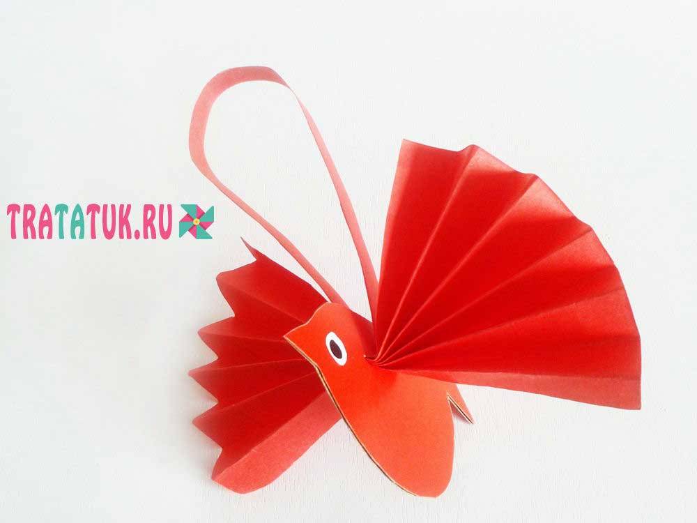Топорщащиеся крылышки как нельзя лучше отображает сложенная в гармошку бумага. Можно сделать много птиц разного вида, которых всех объединяют крылья из цветной бумаги в мелкую складочку. Очень красиво, помимо представленной красной, выглядят райские птички с ярким «оперением», то есть, с разноцветной цветной бумаги, сложенной в гармошку.