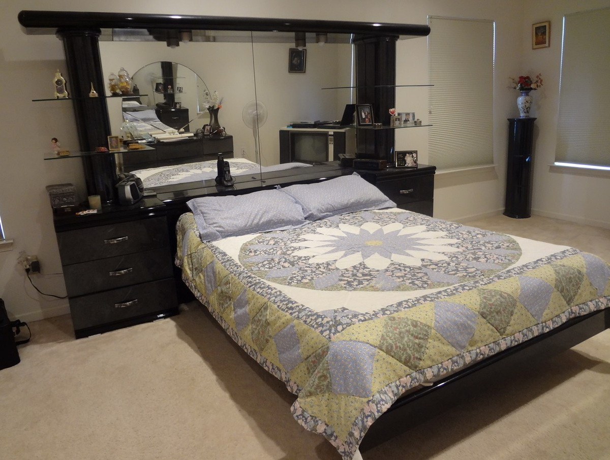 - изголовье массивное, с полками, поэтому стоит на ножках у стены и фиксируется кроватью;