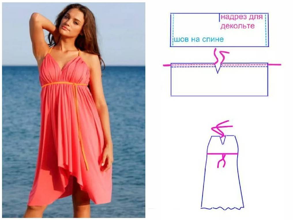 Тем, кто не в состоянии справиться с шитьем модели по стандартной выкройке можно рассмотреть элементарные варианты. Например, допустимо просто соединить швами 2 куска полотна, которые выполнят роль спинки и переда. Дополнительно можно оставить разрезы по бокам, пришить бретели или воланы, декорировать изделие.