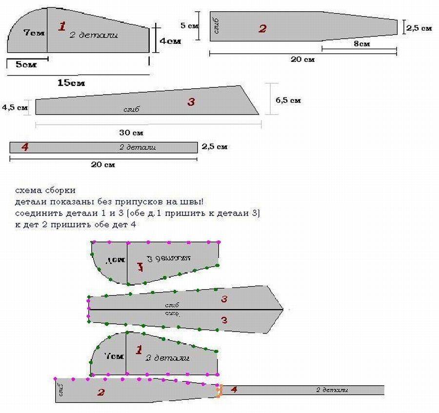 1) Для начала делаем выкройку из бумаги по схеме, изображенной на картинке. Затем переносим ее на выбранную ткань, помечая точки А и Б для сшивания. Вырезаем детали.