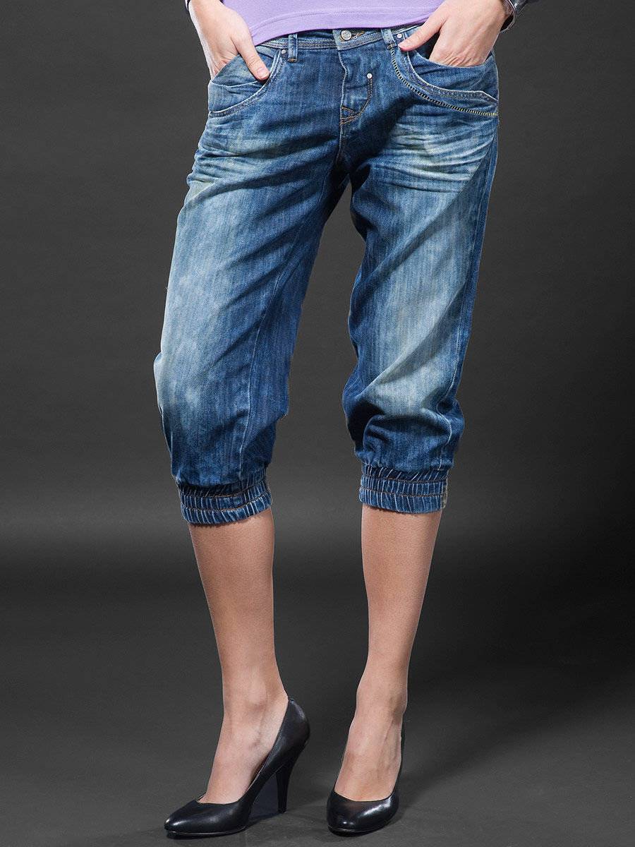 Современный слегка потрепанный вид придаст бриджам из джинсов бахрома по нижнему краю. Деним подходит для этого как нельзя лучше. Для этого следует обрезать джинсы и просто обтрепать срез с использованием наждачной бумаги или терки. Можно также выдернуть поперечные нити, а затем постирать бриджи в машинке. Нижний край можно оформить кулиской, в которую протянуть тесьму. Красиво будут смотреться также винтовые заклепки.
