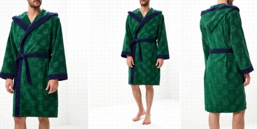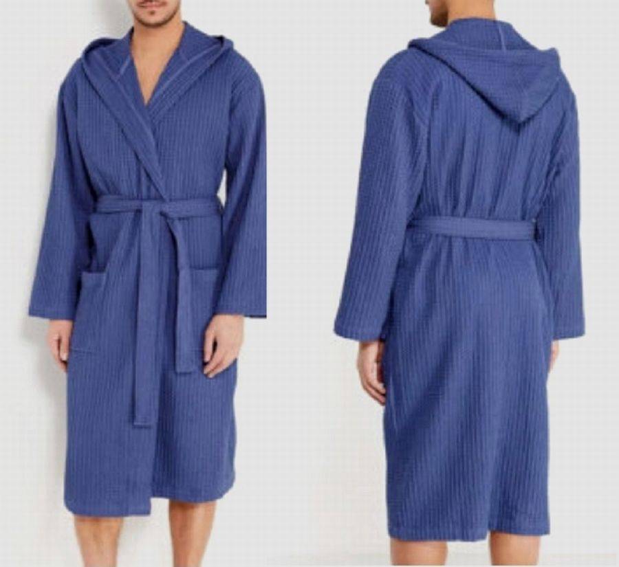 Мужской банный халат с капюшоном из вафельной ткани. Отличается практичностью, поскольку ткань повышенной гигроскопичности и легко отстирывается. Для мужчин рекомендуются расцветки практичные, чтобы грязь не была столь заметной и не бросалась в глаза.