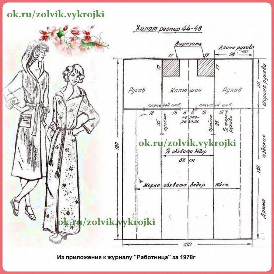 Вот выкройка из приложения к журналу «Работница» с примером халата. Этот халат, если что, будет на запашку.