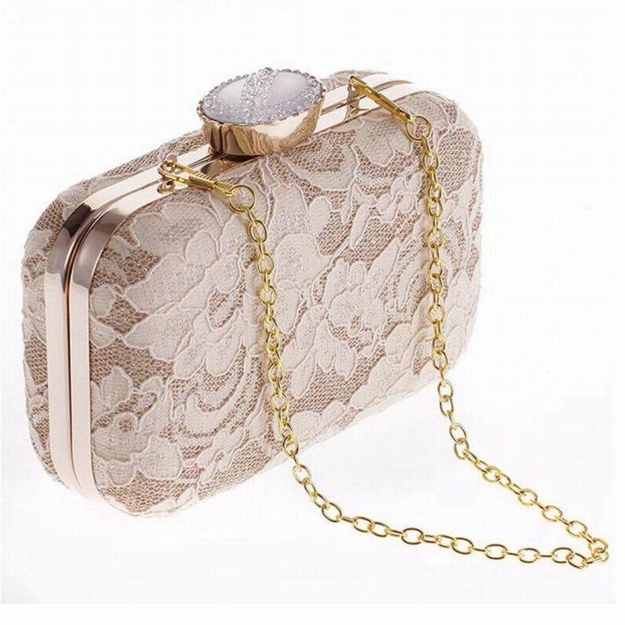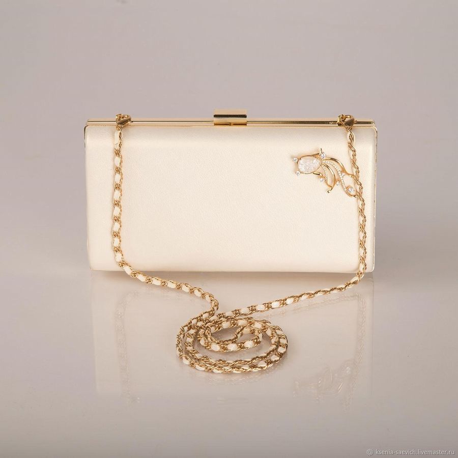 Классический белый клатч с золотистой цепочкой. Такой вариант подойдёт под любой образ и для любого светского мероприятия. Такой вариант можно разнообразить какой-нибудь брошью.