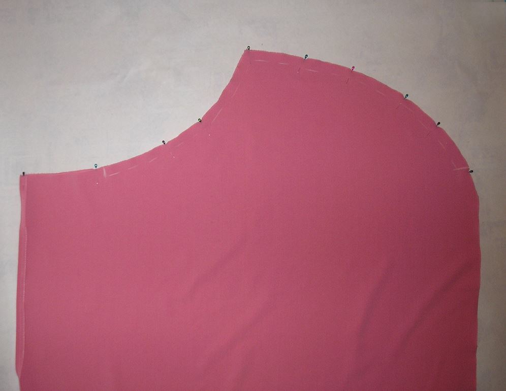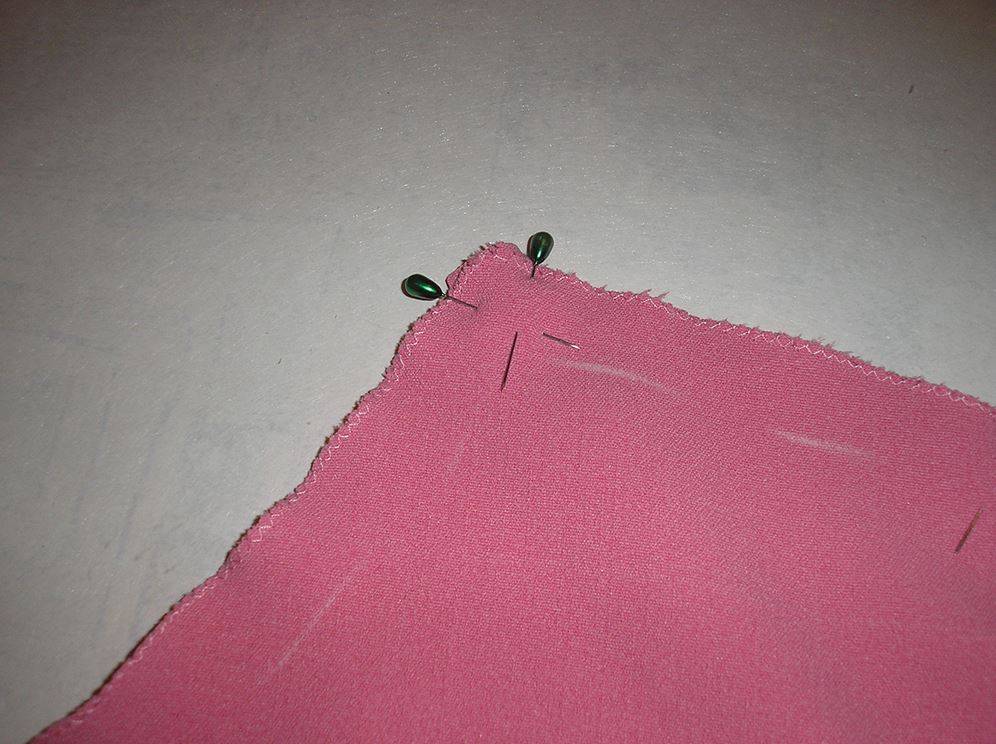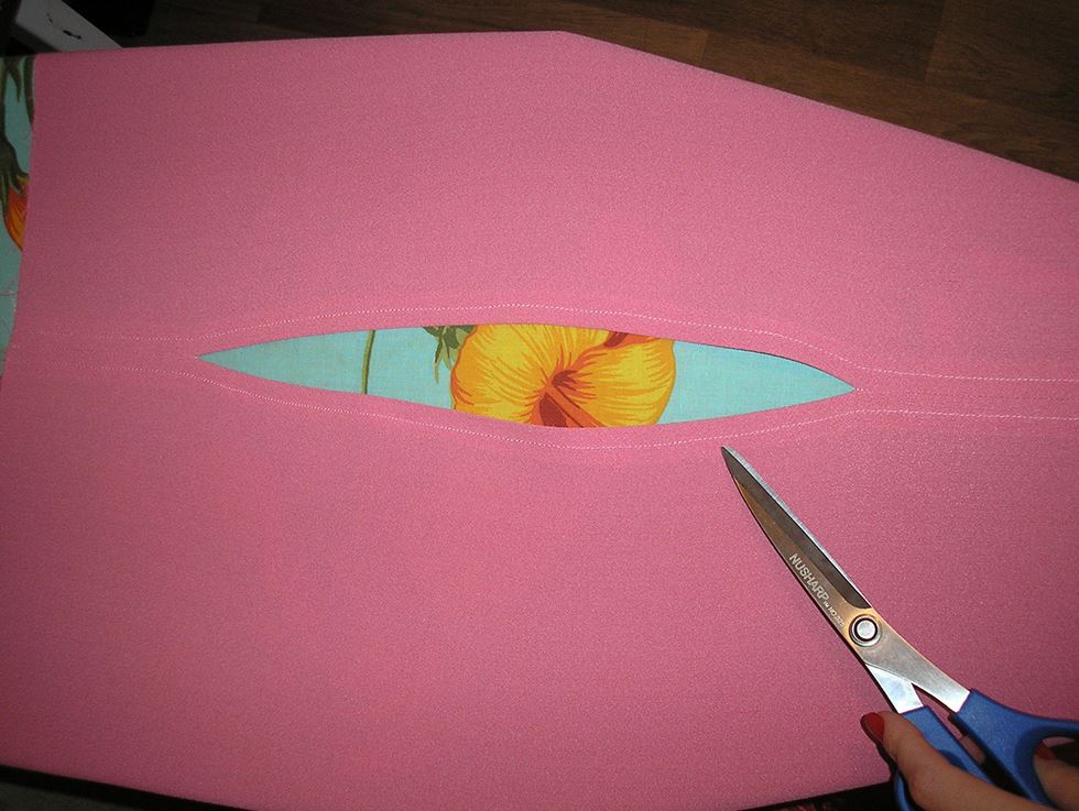 - Чтобы обработать проймы, немного обрезаем ткань в местах скруглений. Закалываем иголками и прошиваем.