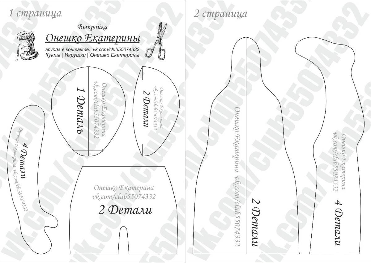 Для начала распечатайте и вырежьте детали выкройки для изготовления куклы своими руками – их всего 4. На ткань переводим в таком порядке:
